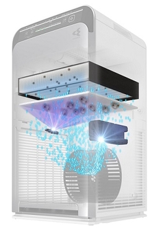 ・「UVC LEDユニット」から90分毎に深紫外線を30分照射する「UV清浄」で、「抗菌HEPAフィルター」を強力に清浄します。「UV清浄」は本体のボタンからも任意のタイミングで運転でき、人の出入りが頻繁な個室など、人が入れ替わるタイミングに合わせて照射することも可能です。また、「抗菌HEPAフィルター」を交換する前に「UV清浄」することで、安心してフィルターを取り出せます。