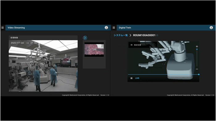 OPTiM Cloud IoT OSの標準モジュールであるDigital Twin を活用し、hinotori(TM)の稼働状態を三次元的に再現します。これにより、手術中のロボットの動作に加え術者の操作もメディカロイドのサポートセンターで視覚的に把握することが出来ます。
