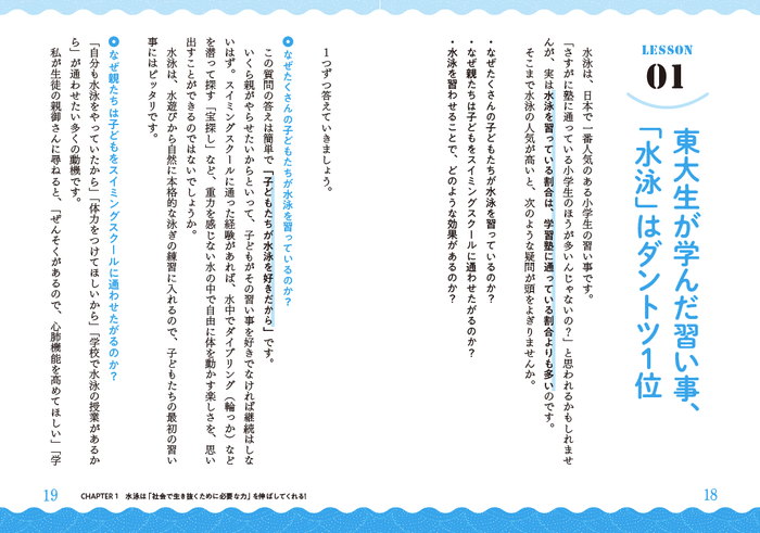 「東大生が小学生時代にしていた習い事」のトップも「水泳」で、他の習い事と比べてダントツの60%が経験者という調査結果があります。東大生の半分以上が、小学生時代に水泳を習った経験があるということです。