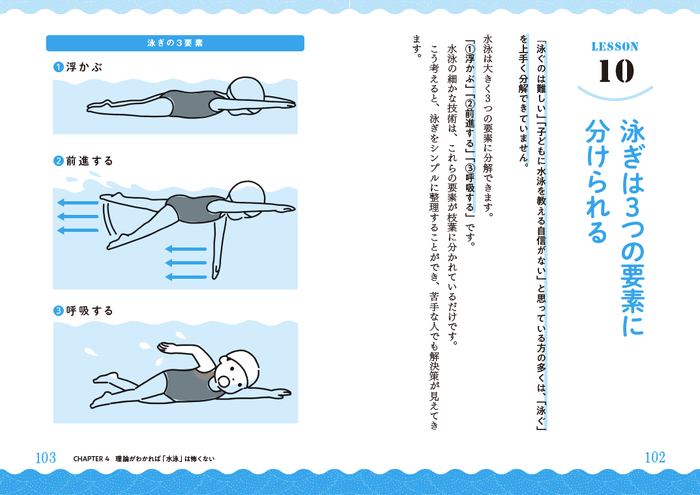 水泳の経験がない保護者の方でも、水泳の「理論」がわかれば、お子さんへの指導は難しいことではありません。本書の後半では、わかりやすいイラストを交えて、水泳のメカニズムと指導方法を紹介しています。