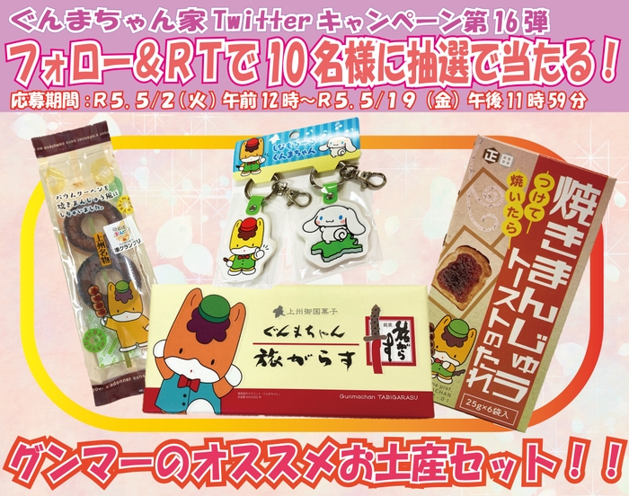 「グンマーのオススメお土産セット」が当たる!! ぐんまちゃん家公式Twitterキャンペーン第16弾を開催中!5月19日(金)午後11時59分まで!!