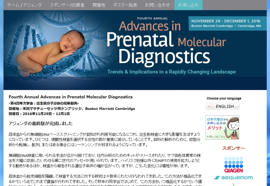 学会:「Fourth Annual Advances in Prenatal Molecular Diagnostics-第4回年次学会:出生前分子診断の最新動向」