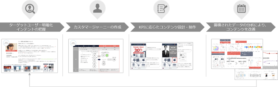 さらに、アイレップと博報堂DYグループ・次世代オウンドメディア・マーケティングセンターで提供しているコミュニケーション設計フレームワーク「HACC+(ハックプラス)」を活用し、インテントの把握から、明確化したペルソナごとのカスタマージャーニーを作成します。各カスタマージャーニーに対し適切な配信頻度・必要な配信量・広告種類を策定の上、コンテンツを制作し、配信したコンテンツをデータ分析することで、PDCAサイクルを回しながら運用の精度向上を実現します(図4)。