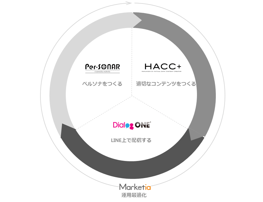 これらの「 Per-SONAR 」、「HACC+」の活用による、ペルソナの作成、また、作成したペルソナに対するコミュニケーションの設計は他SNSのアカウント運用にも活用可能です。LINEにおいてはデジタル・アドバタイジング・コンソーシアム株式会社(本社:東京都渋谷区、代表取締役社長CEO:島田雅也)が所有するLINE ビジネスコネクトメッセージングサービス管理ソリューション「DialogOne®(ダイアログワン)」のアンケート機能やトラッキング機能を活用することで、LINE アカウント上でターゲット像にマッチするユーザーを特定し、ターゲティング配信を行うことが可能になります。