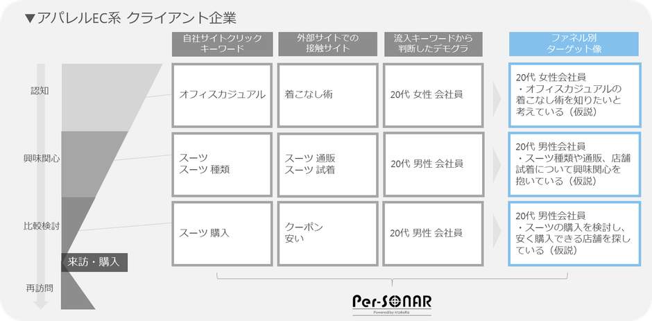 「 Social Dig Connection 」は、まず「 Per-SONAR 」で可視化したコンバージョンユーザーのWeb行動データから、ペルソナやインサイト(購買意欲や消費行動を促す潜在的なきっかけ)を発見し、商品・サービスとマッチする複数のペルソナの設定を行います。明確に複数のペルソナを捉えることで、それぞれのターゲットユーザーが反応しやすい情報の種類やアクティブなタイミングを把握します(図3)。