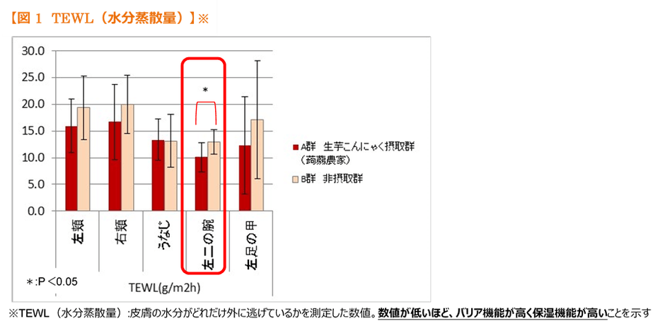今回の結果から、日ごろからこんにゃくセラミドが含まれる生芋こんにゃくを食べているこんにゃく農家の女性たちは、紫外線や空っ風など、肌にとってリスキーな環境にあるにも関わらず水分蒸散量が低く、美肌の基本ともいえる“バリア機能が高い”ことが有意差をもって証明されました。また、シワも少ない傾向にあり、こんにゃくセラミドを多く含んだ食材を食べることが、美肌を維持する上で効果があることが示唆されました。