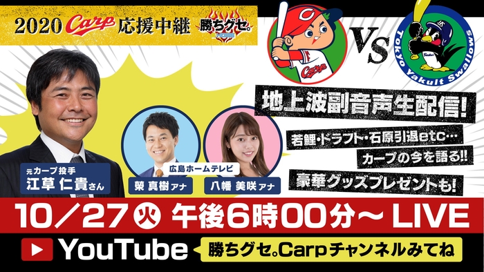 カープ球団お墨付きのYouTube公式チャンネル『勝ちグセ。Carpチャンネル』開設を記念して、広島ホームテレビのプロ野球中継の副音声の裏側をライブ配信でお送りいたします。