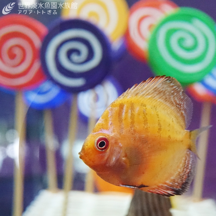 ペロペロキャンディをイメージしたのは、円盤のような形をしたディスカスの仲間です。体の縞模様はキャンディのうずまき模様にも似ています。