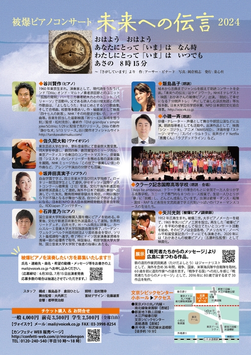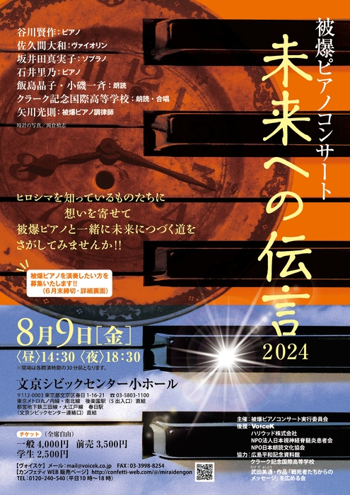 被爆ピアノコンサート実行委員会主催、『未来への伝言2024』が2024年8月9日 (金)に文京シビックホール 小ホール(東京都 文京区 春日 1丁目16-21)にて開催されます。