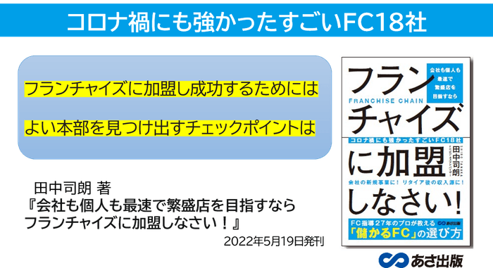 株式会社あさ出版(代表取締役:田賀井弘毅、所在地:東京都豊島区)は田中司朗著『会社も個人も最速で繁盛店を目指すなら フランチャイズに加盟しなさい!』http://www.asa21.com/book/b603020.htmlを2022年5月19日に刊行いたしました。