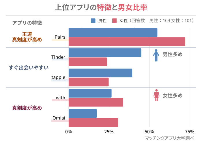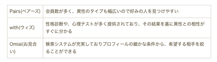 ・女性が多いアプリ → Pairs、with、Omiai(真剣度が高めの王道アプリ)