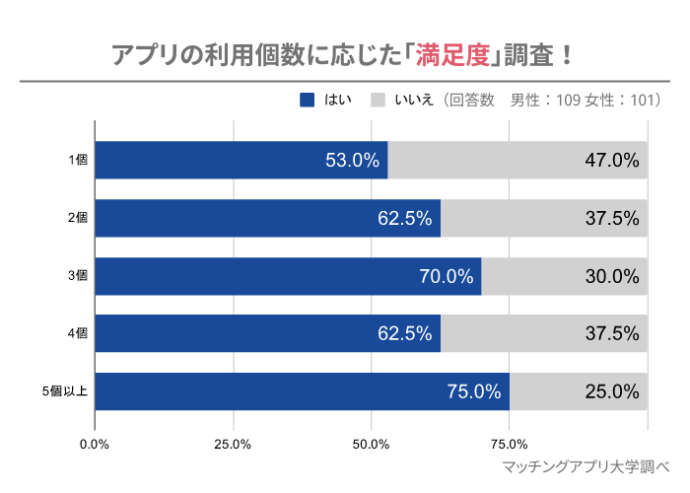 マッチングアプリの複数利用している人に、「アプリを利用して良かったか?」の満足度を調査しました。その結果、1個利用の人より、複数利用した人の方が満足度は高い結果になりました。
