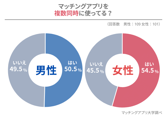 集計の結果、男女共に2人に1人はマッチングアプリを複数利用していることが分かりました。真剣に恋人や結婚相手を探すために、多くの人と出会いたいというユーザーの心理が現れた結果と言えそうですね。