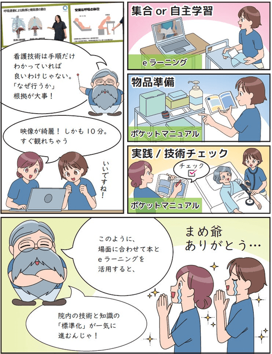 『新人看護職員のための看護手順ポケットマニュアル』×「S-QUE新人看護職員研修」eラーニングで、正確な技術と知識の習得にお役立ていただけます。