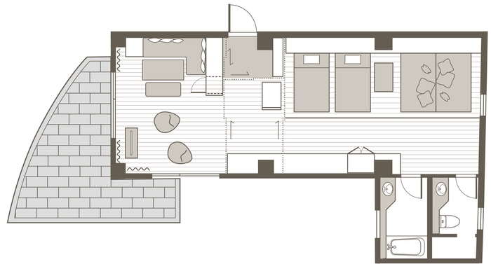 当ホテルはワインリゾートとして、ワインを味わうだけでなく美しい葡萄畑の景色や醸造所の見学など、トータルでワインを楽しめるリゾートを目指しています。今回のリニューアルでは、客室でもワインを感じられるようにインテリアをボルドーカラーで統一しました。一緒に過ごしたい場合は70㎡の室内を自由に行き来でき、人も犬も自宅のように寛げます。ベッドは同じ場所に置いて一緒に寝られます。それぞれのスペースを分けたい場合は、部屋中央にある格子の仕切りを使って大きなケージのように使えるので、圧迫感もなく室内は明るいままです。また、犬がスムーズに動けるように、床の面積を広く、段差を少なくしました。室内のファブリックは防水加工されているので、もしもの粗相も慌てずに対処できる設えです。客室の外にあるプライベートのテラスでは一緒に遊ぶことができます。犬用小物はデザイン性と機能性を重視し、犬も快適で素敵な暮らしが叶います。