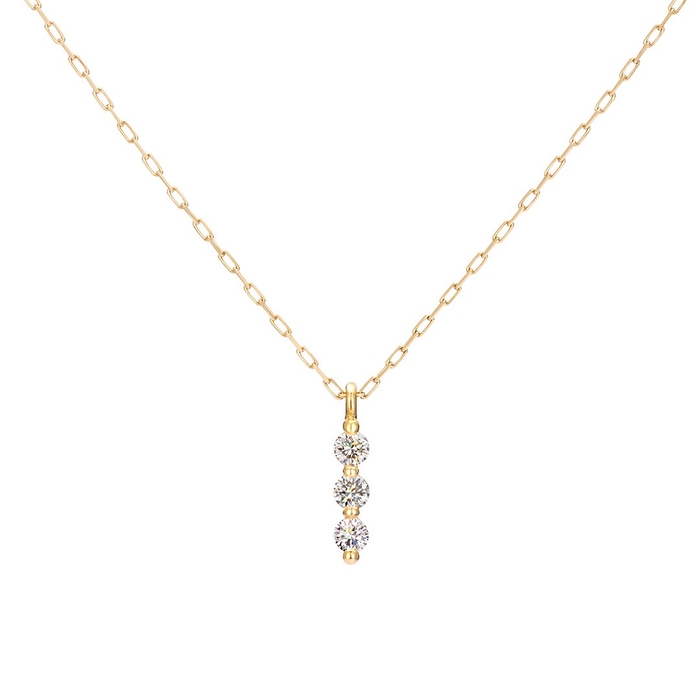 3つのメレダイヤモンドが、胸元でさりげなくきらめくネックレス。繊細なチェーンと小ぶりなペンダントトップの組み合わせは自然と肌に馴染むことから「スキンジュエリー」とも呼ばれ、まるで自分の一部かのようにデイリーに身に着けられます。