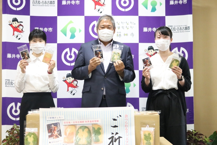 「コロナ禍で働いている医療従事者への感謝の気持ちとして、四天王寺で疫病退散のご祈祷もいただいた大学オリジナルのクッキーをご寄贈いただき、ありがとうございます。藤井寺市民病院、藤井寺保健所の職員にお届けさせていただきます。」