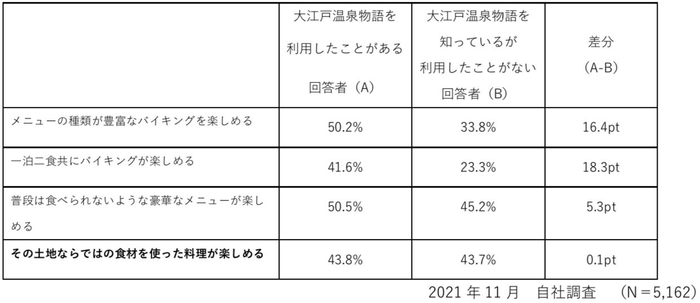 非利用者の予約意向の喚起に「旅先ならでは、その土地の食材」が有益であることが判明しましたが、実際利用いただいているロイヤルユーザーからは、大江戸温泉物語のバイキングに以下のお声をいただいています。