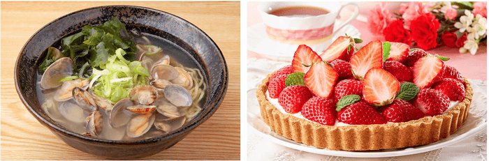 右:仙台いちごをたっぷり使用したタルトを食後にお楽しみください。サクサクのタルト生地、カスタードクリームの上にたっぷりと旬のいちごをトッピングしました。