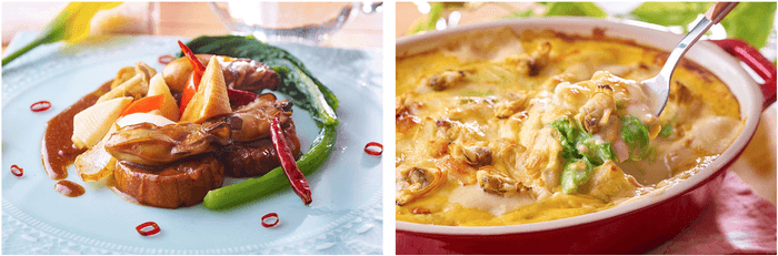 右:大正時代に誕生した仙台白菜、別名「松島白菜」とあさりを使ったグラタン。栽培が難しく傷がつきやすいため市場から姿を消していた時期もありましたが、2011年の東日本大震災で津波被害を受けた土地で栽培されることになり再び脚光を浴びています。
