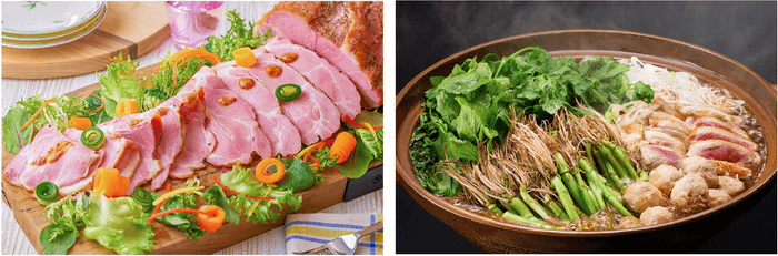 左:宮城県生まれの銘柄豚「宮城野豚(ミヤギノポーク)」を使ったローストポーク。ゆっくりと火入れした、しっとりとした肉質をお楽しみください。