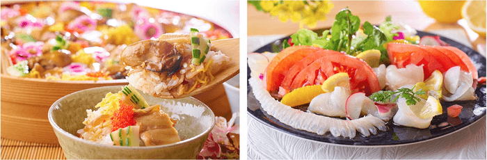 左:特製の醤油ダレで炊いた宮城県産の牡蠣と穴子が具材のバラちらし。酢バスや錦糸卵の彩りが春らしさを演出します。