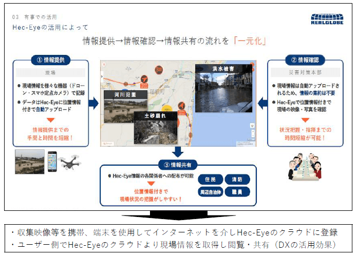 「Hec-Eye」はリアルグローブが、一般社団法人EDAC監修のもと開発した、ドローン等からの取得情報を地図上に集約し共有するプラットフォームで、総務省の「平成27年度補正予算IoTサービス創出支援事業」の採択案件を通じて構築されたリファレンスモデル(成果物)を核として開発されたサービスです。救急医療・災害対応分野での活動支援や業務効率化を目的として開発され、現在は鳥獣害対策や観光分野等も含めたより広い分野で活用されています。