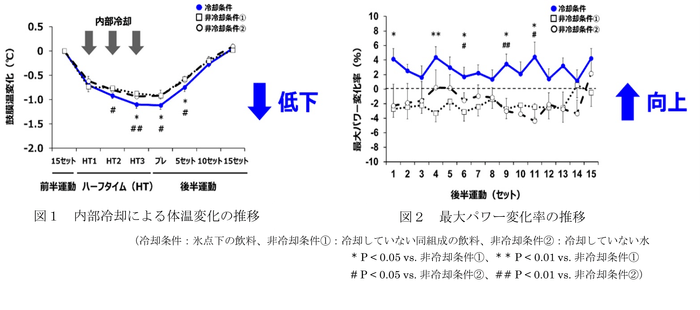 スポーツの現場では、暑熱環境対策として、身体内部から深部体温の上昇を抑制する手法の活用が拡大しています。本研究では、内部冷却が体温及び運動パフォーマンスに及ぼす効果を検証いたしました。その結果、非冷却条件下と比べて、内部冷却により、速やかに鼓膜温度が低下(図1)すること、さらに、自転車エルゴメーター運動により評価される運動パフォーマンス(最大パワー)が向上することが確認されました(図2)。