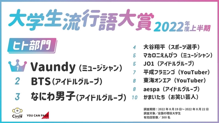 1位に輝いたのは現役大学生シンガーソングライターである「Vaundy」。「Vaundy」が現役大学生であることから、歌詞やメロディーが大学生の心を鷲掴みにしたようです。また、TikTok内の楽曲としても多く利用され、大学生にとって耳にする機会が多かったことが要因かもしれません。