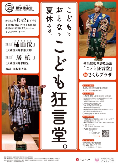 横浜能楽堂(公益財団法人横浜市芸術文化振興財団)主催、こどももおとなも夏休みは、こども狂言堂。『横浜能楽堂普及公演「こども狂言堂」in さくらプラザ』が2025年8月2日 (土)に横浜市戸塚区民文化センターさくら プラザホール(神奈川県横浜市戸塚区戸塚町16番地17)にて開催されます。
