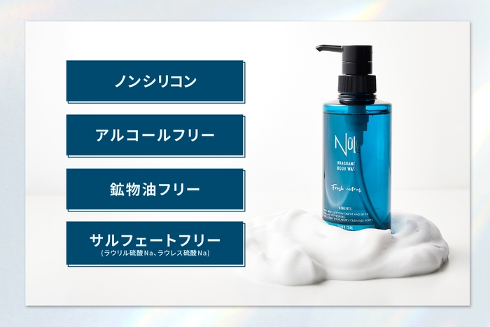 本製品は、楽天ランキング40部門で1位獲得した『NULL 薬用フレグランス ボディウォッシュ』のクールタイプ。メントール(清涼成分)と冷感持続成分※2が、ベタつきやニオイ、汗をスッキリと洗い流し、心地良いひんやり感をキープします。