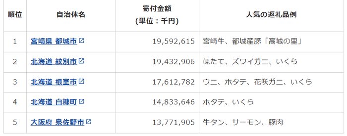 ・前年2位だった都城市が1位に。寄付金額は195億円超