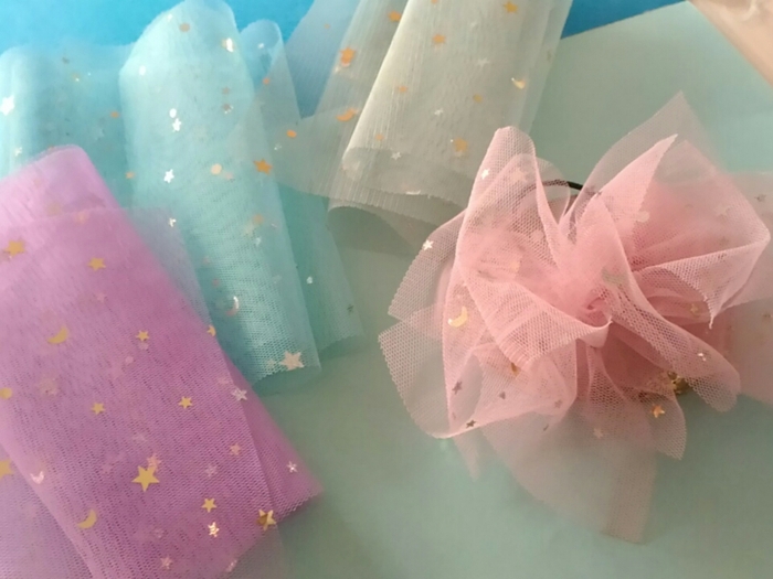 チュール生地はピンク・ライトブルー・ライトグリーン・パープルの4色の中からランダムで3枚届きます。別売りでホワイト・ブラックもあるので自分好みに作れるのもポイント♪