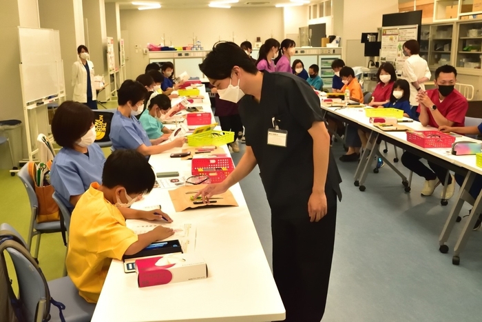 今回のプログラムでは、小学5・6年生を対象に、医療技術学部 臨床工学科 辻義弘准教授が「『おしっこ』ってどうやって作られるんだろう?人工腎臓で学ぶ腎臓の不思議な働き」をテーマに講義や実験等を企画し、10名の小学5・6年生とその保護者が参加しました。また、実施協力者として、臨床工学科の学生6名、本学臨床工学科卒業生2名が参加しました。