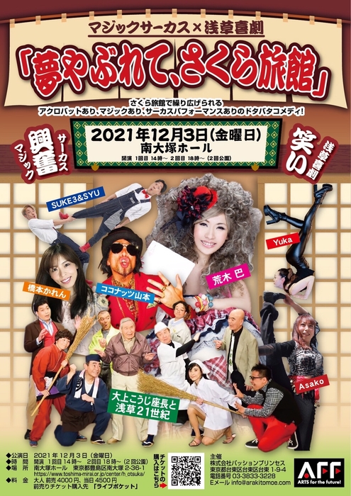 株式会社パッションプリンセス イリュージョン×浅草喜劇コラボレーション公演『夢やぶれて、さくら旅館』が2021年12月3日(金) に南大塚ホール(東京都豊島区)にて上演されます。チケットはカンフェティ(運営:ロングランプランニング株式会社、東京都新宿区、代表取締役:榑松 ⼤剛)にて発売開始予定です。