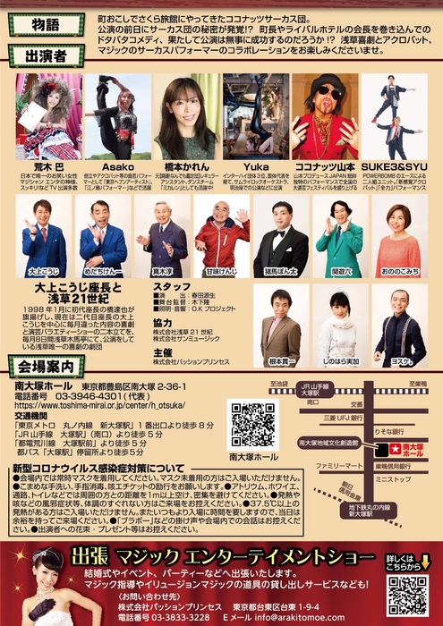 不思議で華やかなマジックと3組の忍者による殺陣にアクロバットにコントのパフォーマンス。そして、笑いで混乱の世の人々を励まし続けた芸人、、令和の時代も笑って元気になるショータイム!