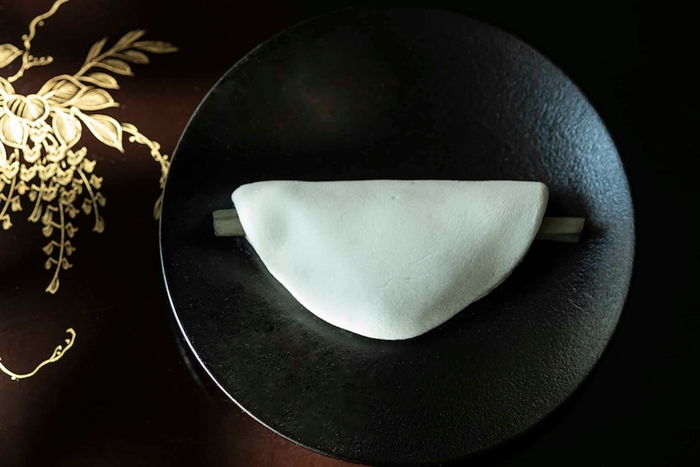 江戸時代の芝居茶屋では、酒肴や水菓子などが次々に供されていました。本プログラムでは、そうした芝居茶屋のおもてなしに倣い、星のや東京総料理長・浜田統之(のりゆき)監修の酒肴とワインを提供します。「宴遊(えんゆう)日記別録」の記述によると、江戸時代、芝居鑑賞後には夜餉(よるげ)として蕎麦が出されていました。そこから着想を得て考えたのが、蕎麦に見立てたモンブランとデザートワインのペアリングです。江戸漆器の蒸篭(せいろ)で提供するモンブランには、和栗のペーストを使用し、中にはジェノワーズ(スポンジ生地)、クレームシャンティ、栗の甘露煮を忍ばせています。さらに、豆皿に添えて提供するのは、蕎麦の薬味に見立てた「七味のメレンゲ」、「生姜のパート・ド・フリュイ*3」、「山葵のプラリーヌ*4」です。実際の蕎麦の薬味のように、モンブランと一緒に食べることで味に変化が生まれます。これらとペアリングさせるのは、甘味とシャルドネの酸味のバランスが良い貴腐ワインです。樽で熟成された、ほのかな甘く香ばしい香りが特徴で、モンブランの味わいに深みを与えます。