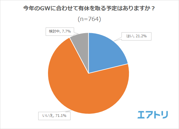 現在就業中の人に、今年のGWに合わせて有休を取る予定があるか聞いたところ、「はい」(21.2%)と回答した人は約5人に1人で昨年の同調査※1と大差ない結果となりました(昨年「はい」(24.4%))。