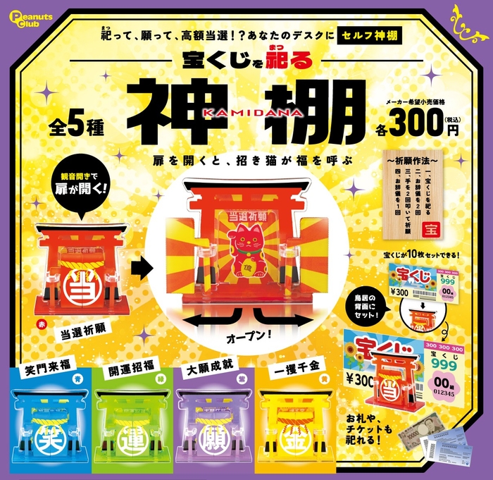 株式会社ピーナッツ・クラブ(本社・大阪府東大阪市、代表取締役社長・前田泰裕)は、カプセルトイの新製品「宝くじを祀(まつ)る神棚」を2025年7月下旬より順次、全国のカプセルトイ売場で販売します。