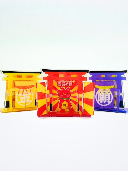観音開きで扉が開き、扉の向こうには福を呼ぶ可愛い招き猫のイラストが描かれています。鳥居の背面には、宝くじ10枚を立てて置くことができ、卓上や運気の良さそうな場所に置いて毎日祈願すれば、高額当選するかも?!