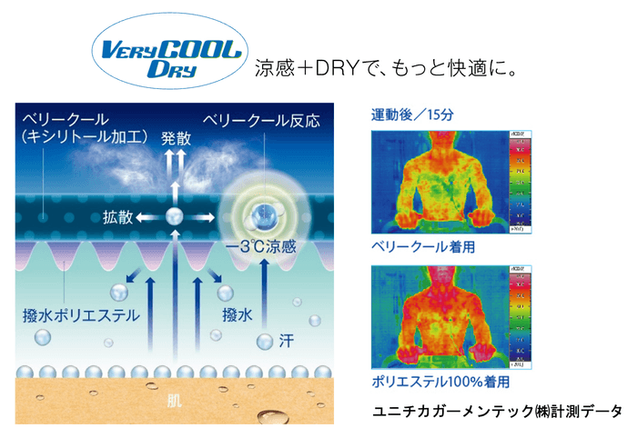 ウェア内を約3℃低く保つ「ベリークール」と肌面をドライにする機能を併せ持つ素材です。生地に配合したキシリトールが汗に反応して熱を吸収。また、汗を素早く吸収・拡散させて乾燥を促進させる生地構造を採用しています。クーリング効果と汗のベタつきのストレスを軽減させることで選手のパフォーマンスを向上させます。