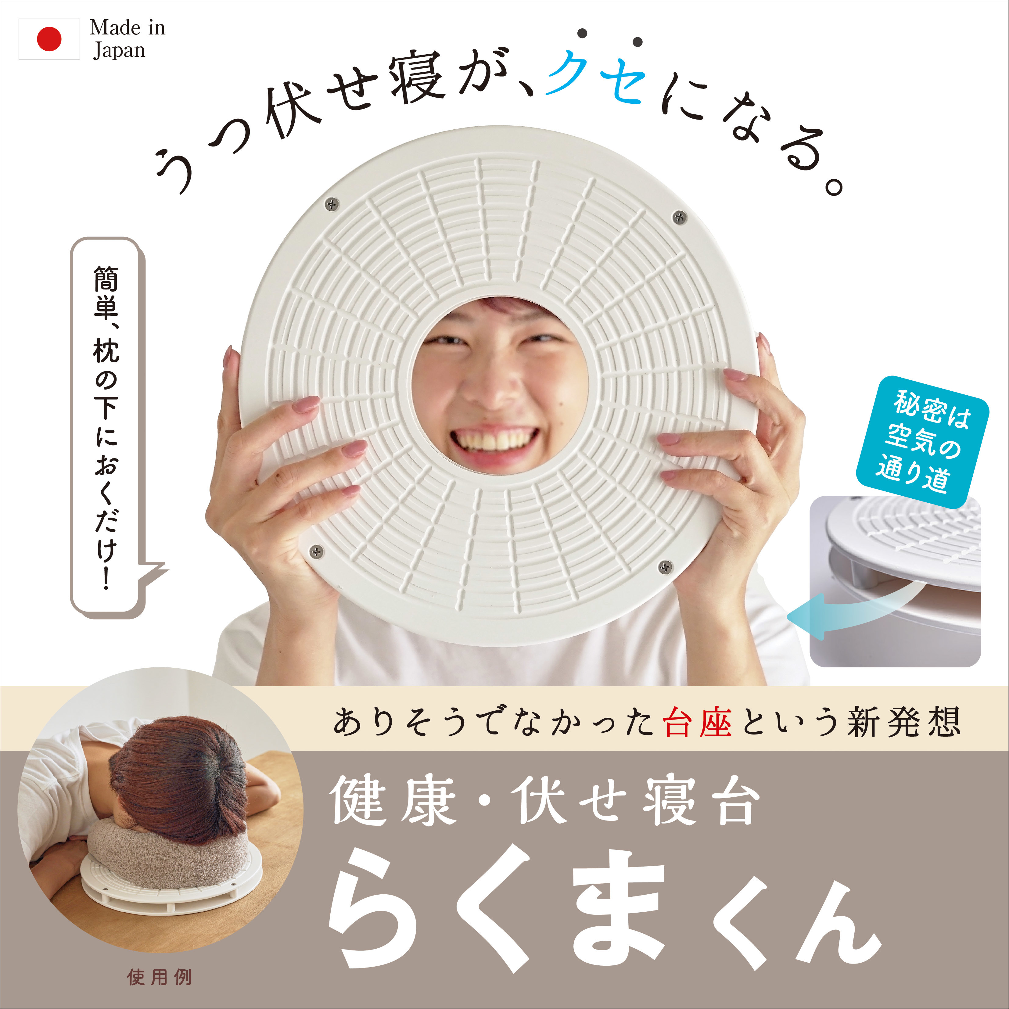 うつ伏せ寝をしようとしたとき、伏せ寝枕使用中に息苦しくなってしまうことが有ります。原因は空気の通り道が十分確保されてないからです。このことを伏せ寝枕の下に中空台座を敷くことで解決。
