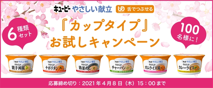 キユーピー株式会社(本社:東京都渋谷区、代表取締役 社長執行役員:長南 収、以下キユーピー)は、市販用介護食「やさしい献立」シリーズから、カップタイプの新商品6種類※1がセットで当たる「『カップタイプ』お試しキャンペーン」を実施します。公式サイト※2のアンケートに回答いただいた方の中から、抽選で100名様にプレゼントします。