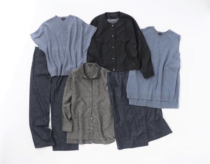 爽やかなシャンブレー生地のジャケットやパンツ、抜け感のあるくすみブルーのニット、シーンや気分によって変えられるリバーシブル仕様のトートバッグなど、シーズンレス、タイムレスに長くご愛用いただけるアイテムを多数ラインナップいたします。