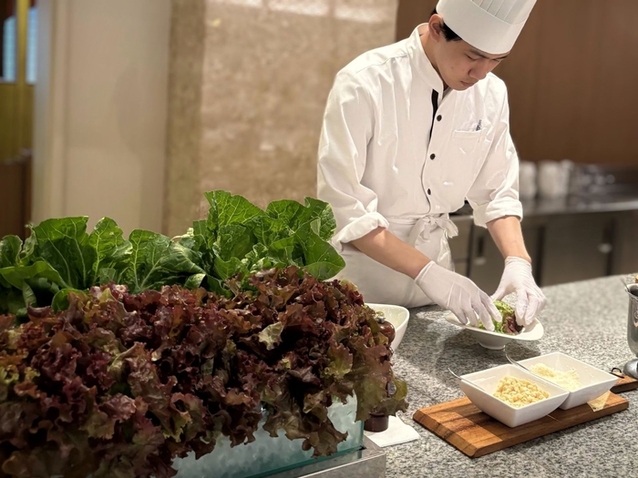 畑で植えられている様子がイメージできるようなディスプレイにし、目の前でサラダにしてお客様へ提供しています。