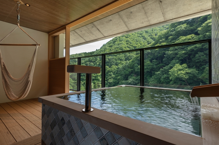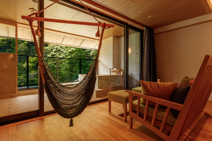 最上階7階の“里山Seyryu”サウナsuiteは限定3室。それぞれタイプが違う100㎡~のスイートルームは、プライベートで楽しめる源泉かけ流し露天風呂と里山の景色が見えるロウリュサウナ付き。サウナで汗をかいた後は、優しい風がそよぐハンモックテラスで贅沢な外気浴で“ととのう”滞在ができます。