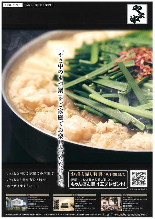 是非、おうち時間にやま中の絶品もつ鍋をご賞味ください!