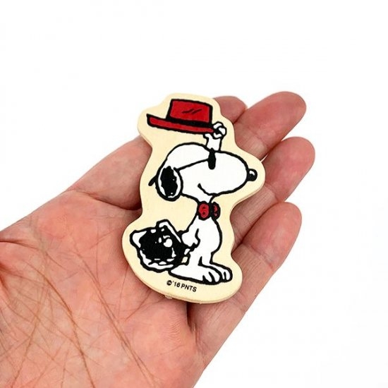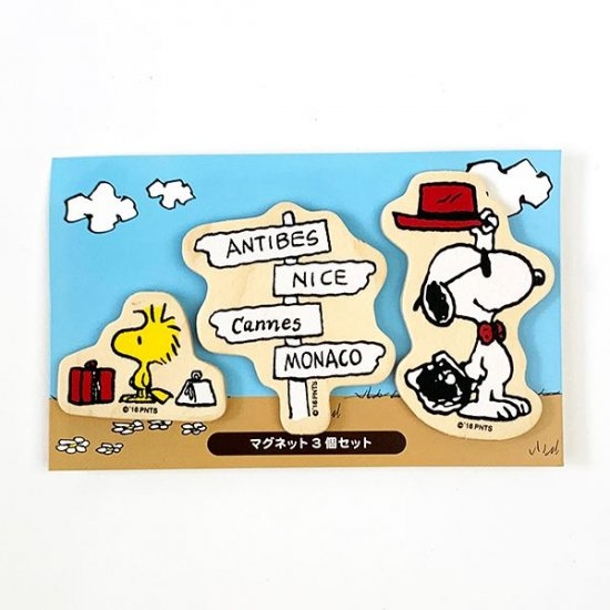 トラベルを楽しむスヌーピーのマグネット。こちらも木製です。ひとつのテーマに沿ってそれぞれがつながりを持っている、ストーリー要素のあるマグネットは飾れば楽しいマグネットです。