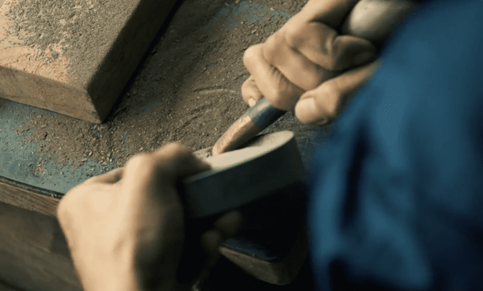 実際に職人の方が使っている30cmほどの大きなノミを使って、「墨堂(ぼくどう)」という墨を磨る面を彫ります。その後、砥石や耐水ペーパーなどで表面を滑らかに仕上げます。最後に、泥砥石(どろといし)と呼ばれる専用の研ぎ石で、墨をおろすための微細な凹凸をつける「目立て」を行い完成です。道具を使い、赤間石を硯に変化させていく工程は、職人が代々受け継ぎ、培ってきた正に「手業」と呼べるもので、その一部を経験できることはとても貴重です。出来上がった硯は職人が仕上げを行い、後日スタッフが郵送します。