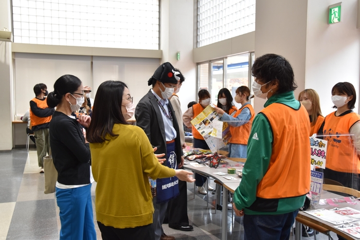 販売ブースには、岩手県の持ち歩く羊羹やしいたけの菌床、熊本県の栗んとうなど、ユニークな商品が数多く並べられ、通りがかった学生や教職員は興味深そうに足をとめて商品を眺めていました。学生たちのおすすめはしいたけの菌床。しいたけを育て、収穫する楽しみをぜひ体験してほしいとのことでした。
